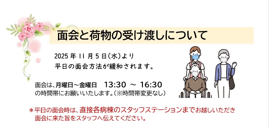 ホーム > 当院について > お知らせ > 面会・荷物(洗濯物その他)の受け渡しについて